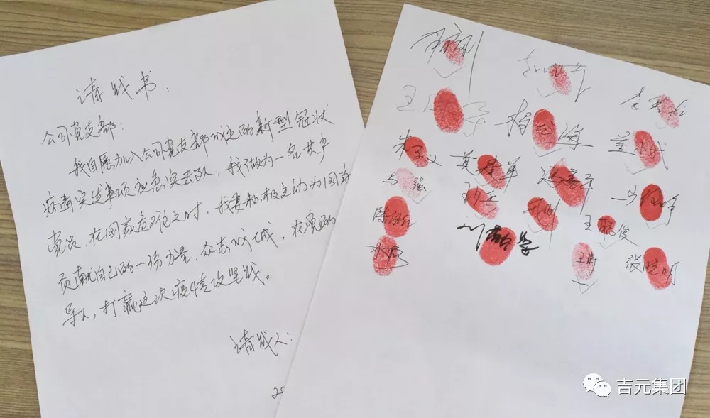 眼前的一幕仿佛又回到了戰(zhàn)火紛飛的年代。2020年2月6日下午15:00,在吉元集團(tuán)紅領(lǐng)學(xué)院的一張木桌上,在一張臨時(shí)準(zhǔn)備的白紙上,吉元集團(tuán)19名黨員及入黨積極分子鄭重的簽下了自己的名字、按下了鮮紅的手印。他們志愿加入吉元集團(tuán)抗擊冠狀病毒疫情防控應(yīng)急救援黨員突擊隊(duì)。